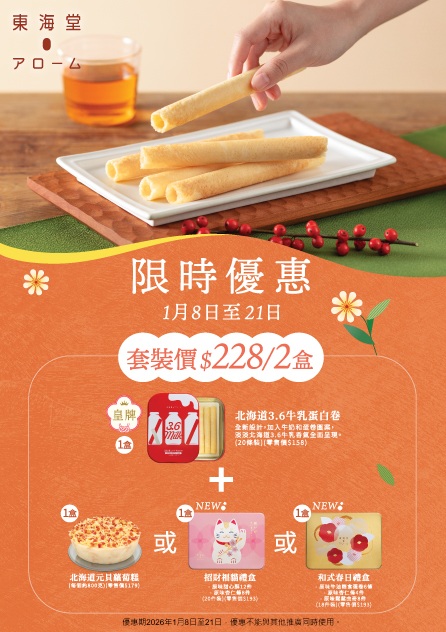 購買東海堂指定賀年產品,即可享限時優惠套裝價$228/套,優惠期 2026年1月8日至21日。