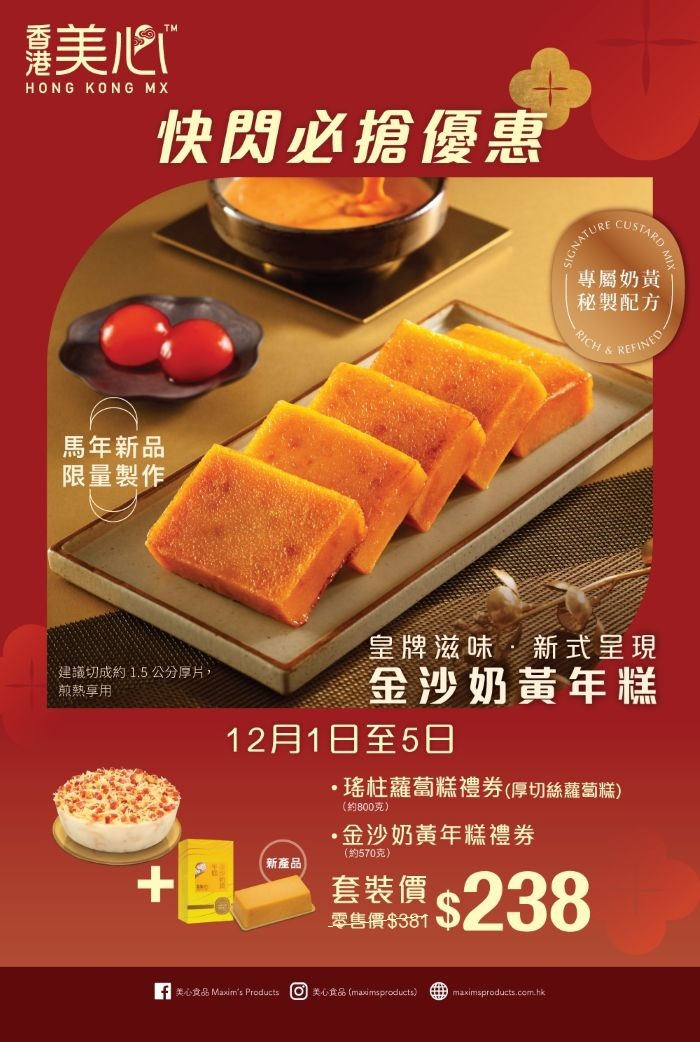 由12月1日至5日,新品套裝 【美心瑤柱蘿蔔糕(厚切絲蘿蔔糕) + 美心金沙奶黃年糕 】只需 $238,電子禮券及實體禮券適用。