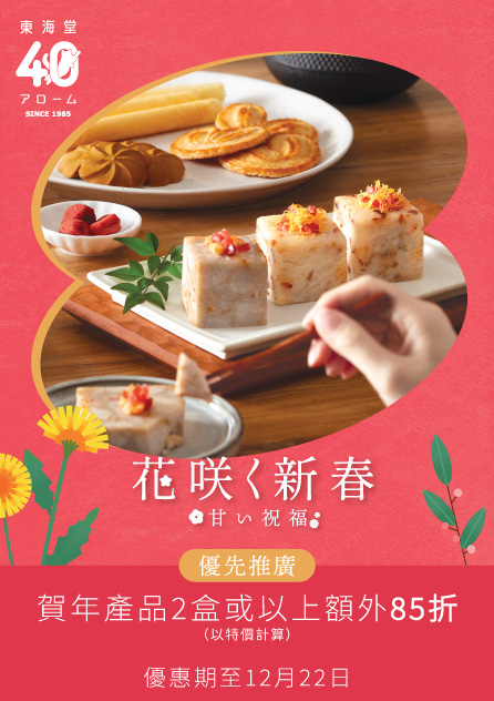 即日至2025年12月22日,東海堂賀年糕點/禮盒 2張或以上,即享【額外85折】優惠*,立即搶購!(*優惠以特價計算)