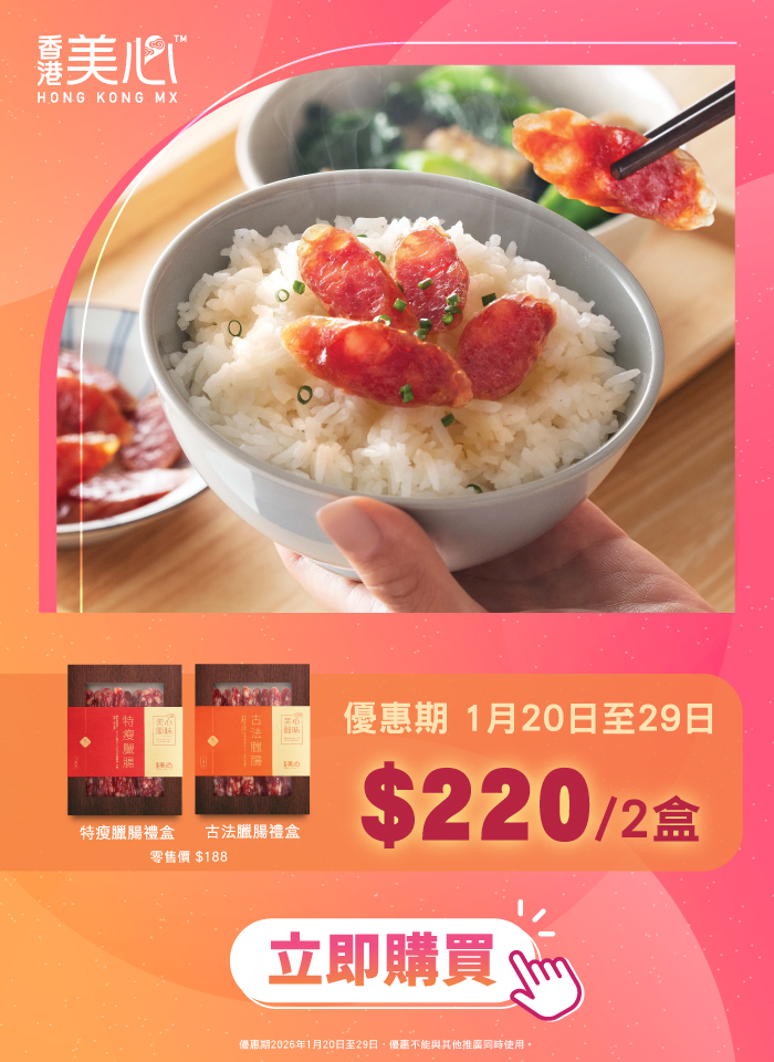 【限時優惠】臘味禮盒任揀2盒只需$220,買任何產品可以 $128 換購臘味禮盒 (8條裝),優惠期2026年1月20日至29日,此優惠不能與其他優惠同時使用。(實體禮券、電子禮券及現貨同時適用。)
