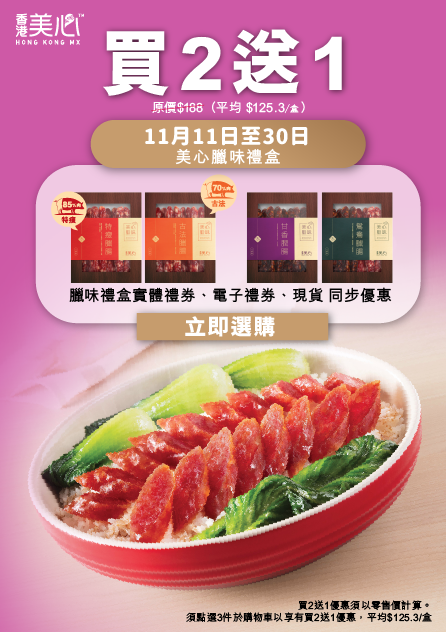 1. 美心臘味禮盒買2送1優惠至2025年11月30日,優惠須以零售價計算,此優惠不能與其他優惠同時使用。
