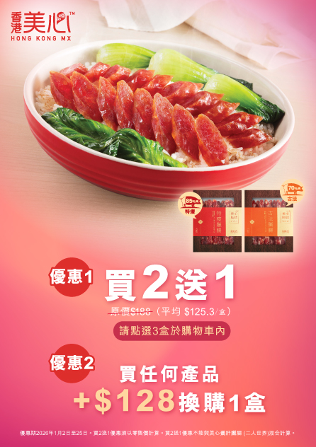 1. 美心臘味禮盒買2送1優惠2026年1月2日至25日,優惠須以零售價計算,此優惠不能與其他優惠同時使用。