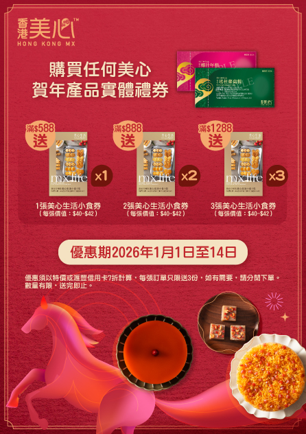 【美心賀年禮券限時優惠】2025年1月1日至1月14日,凡購買美心及東海堂賀年產品<實體禮券>,即送您美心生活小食禮券(價值$40)︰購買滿$588禮券送1張、購買滿$888禮券送2張、購買滿$1288禮券送3張。