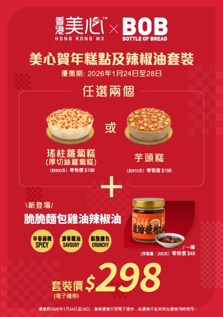 新春將至,為佳節餐桌添點滋味!由 2026 年 1 月 24 日至 1 月 28 日,凡選購指定美心賀年糕點,即可享超值套裝優惠。