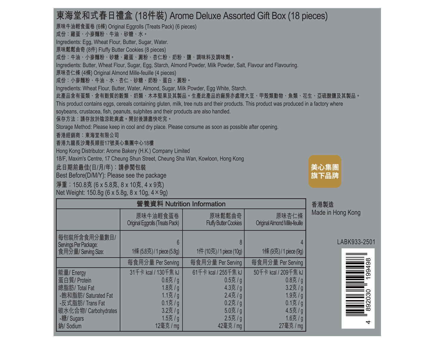- 原味杏仁條192層鬆脆酥皮,鋪上杏仁片,經細火烘焗後,滿載牛油及杏仁香。