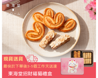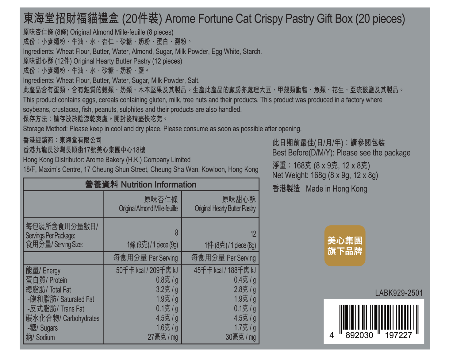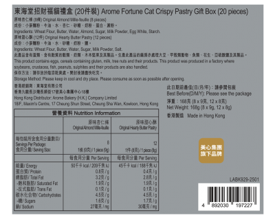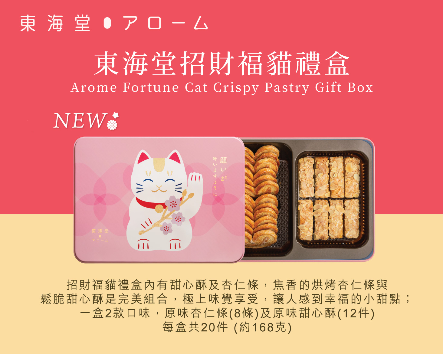 招財福貓禮盒內有原味甜心酥(12件)及原味杏仁條(8件),焦香的烘烤杏仁片與鬆脆甜心酥是完美組合,極上味覺享受,讓人感到幸福的小甜點。
