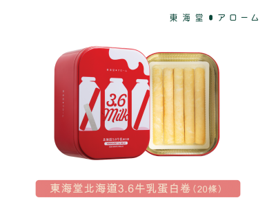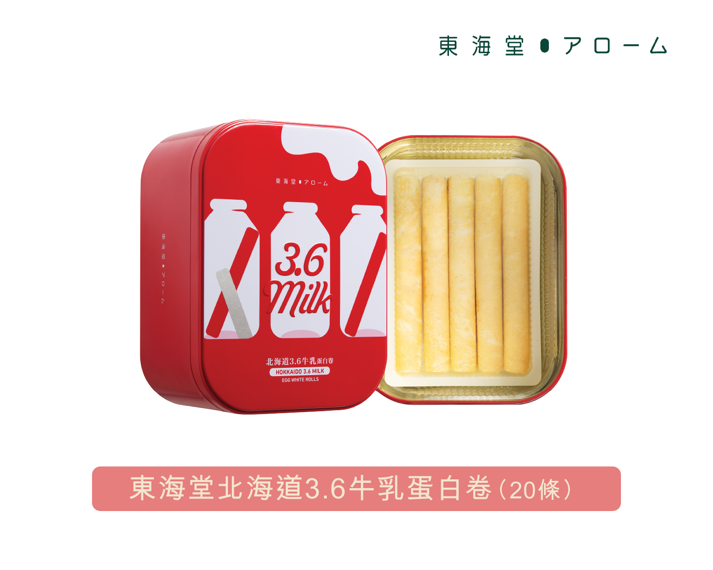 亮麗奪目的紅色與牛奶樽設計鐵罐,內有以北海道3.6牛乳及優質蛋白精心烘焗的牛乳蛋白卷;奶香郁醇,蛋白清香突出,輕盈不膩;不含蛋黃,格外鬆脆,教人一試愛上!