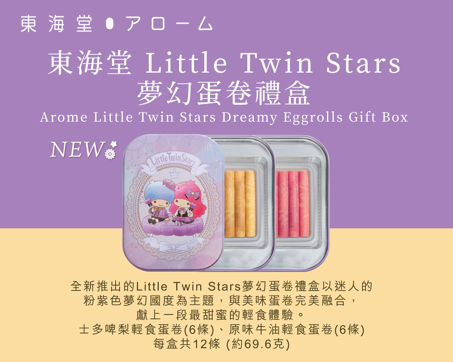 讓 Kiki 與 Lala手握的糖果棒為您打開夢幻的味覺享受!全新推出的Little Twin Stars夢幻蛋卷禮盒以迷人的粉紫色夢幻國度為主題,與美味蛋卷完美融合,獻上一段最甜蜜的輕食體驗。