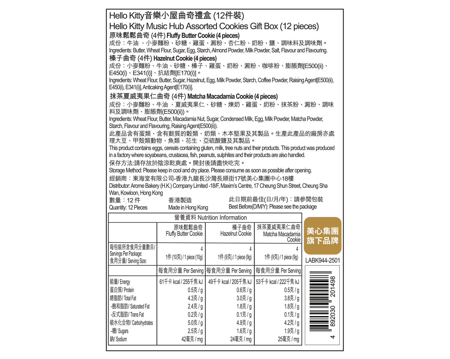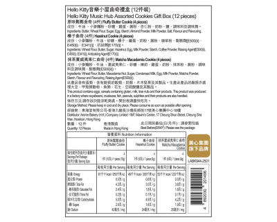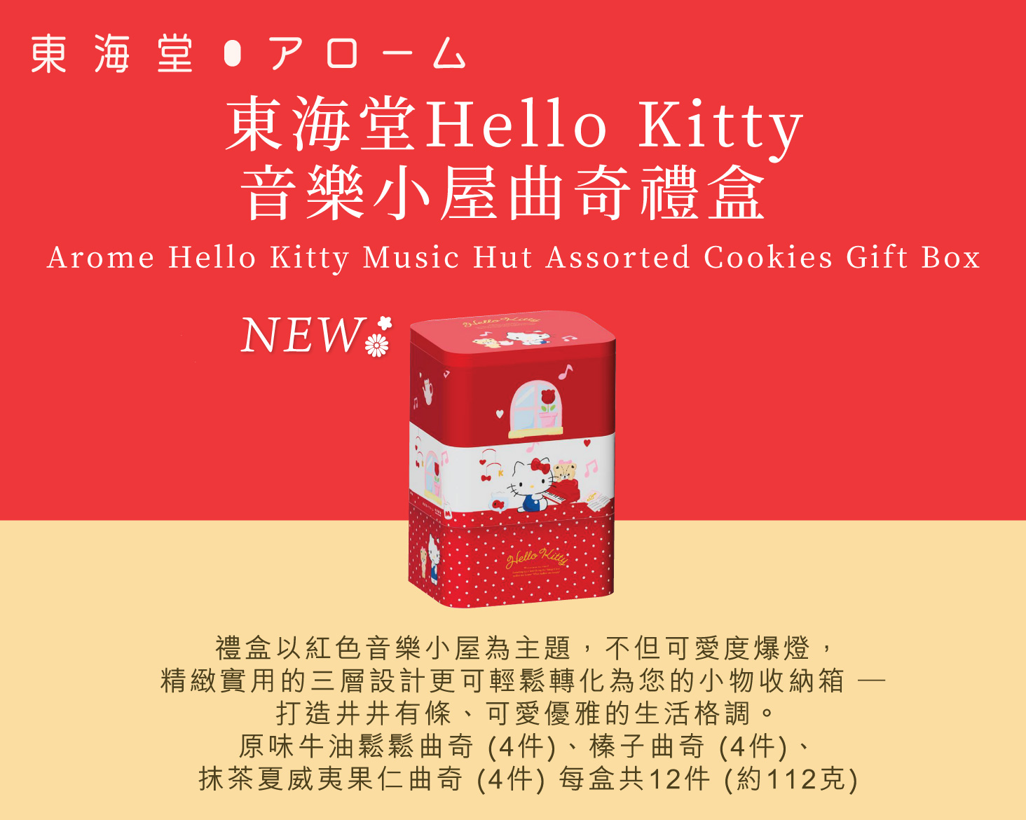 全新可愛的Hello Kitty 音樂小屋禮盒內含三重香濃滋味-「原味牛油鬆鬆曲奇」口感鬆脆、充滿濃郁牛油香氣,加上2款全新口味 - 「榛子曲奇」及「抹茶夏威夷果仁曲奇」,獨特的堅果油脂與曲奇香氣徹底釋放,每一口都是令人回味的小確幸。