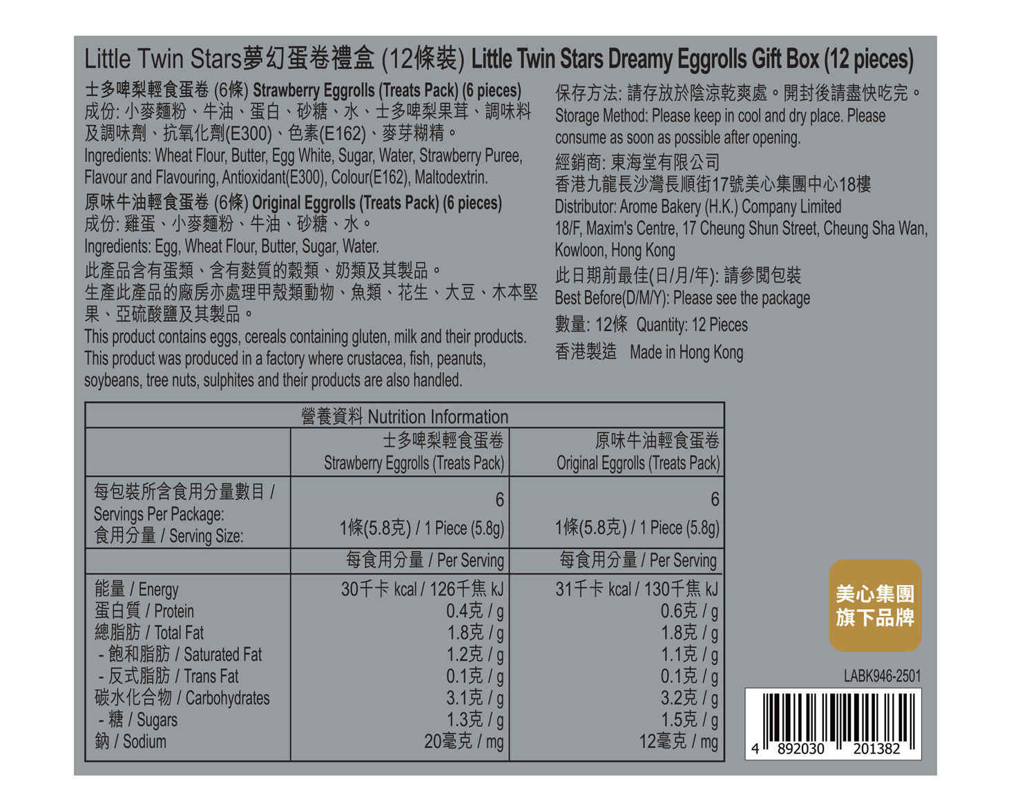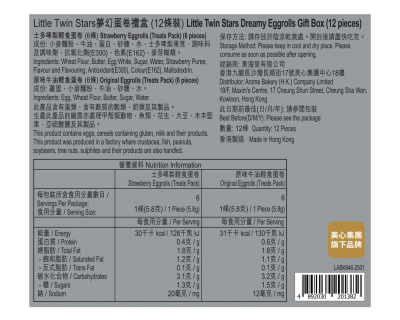禮盒內含2款鬆脆的輕食蛋卷,經典原味蛋卷採用純正法國牛油用心烘製,香氣濃郁誘人;全新的士多啤梨口味猶如 Little Twin Stars 灑下的甜蜜魔法,果香味層層分明,每一口都令人回味。從精緻的禮罐到專屬造型的紙袋都充滿了迷人的細節,讓您置身於甜美夢幻的童話世界。