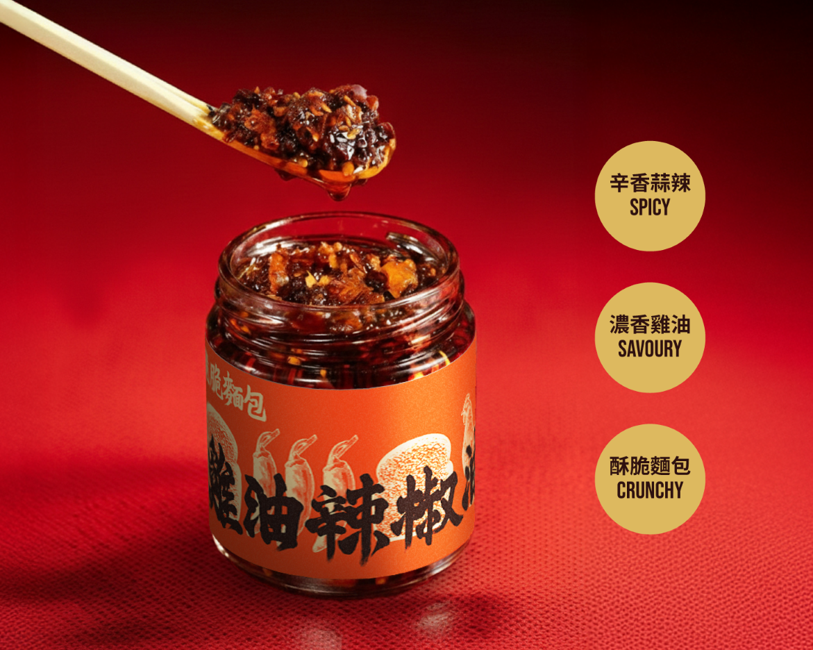 BOB 脆脆麵包雞油辣椒油以雞油煉萃,加入啖啖酥脆麵包,烘焙大麥與雞油鹹香交織,香辣惹味,層次十足,無論拌麵、蘸點心或入饌,都風味倍增!