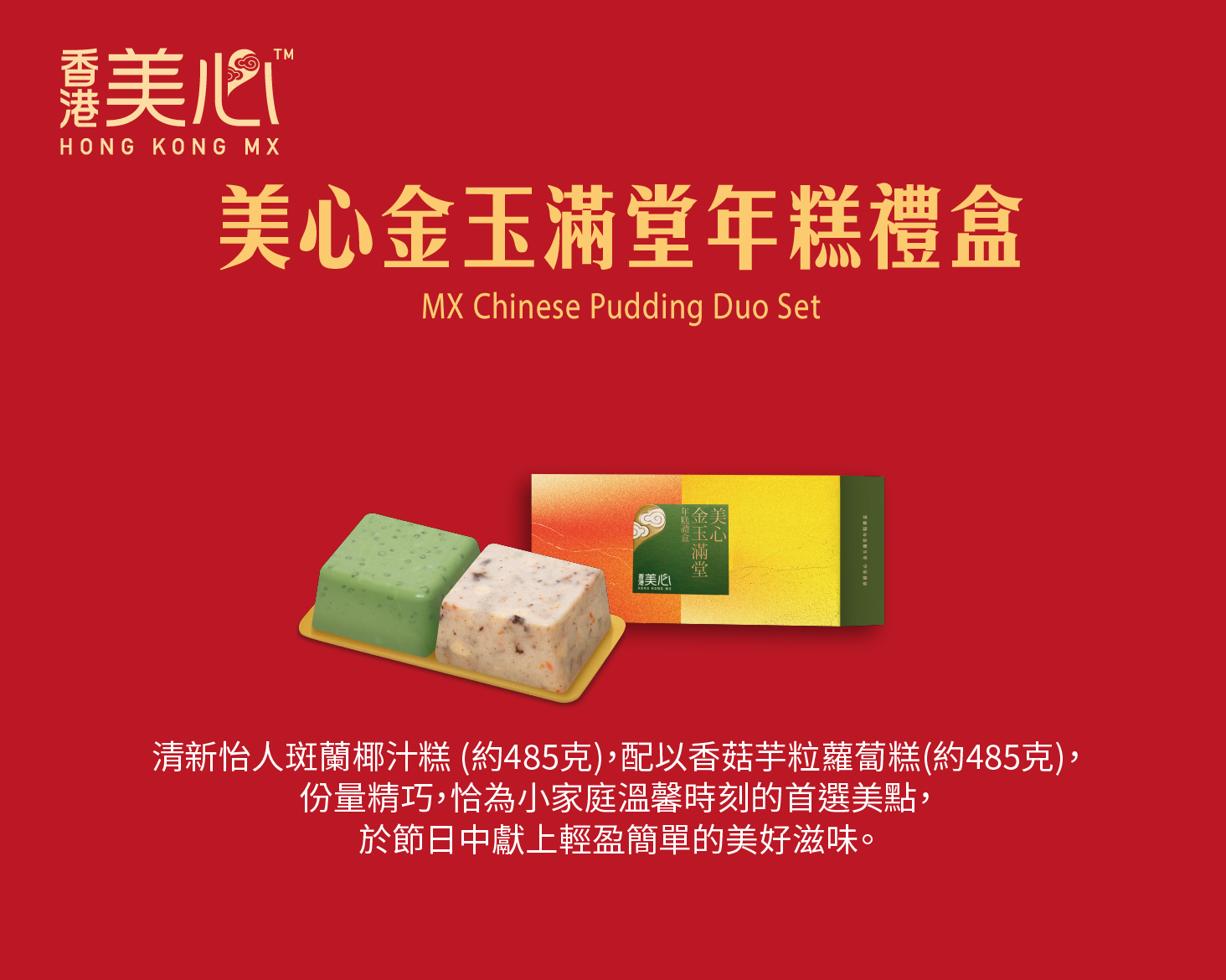 精裝禮盒內有清新怡人斑蘭椰汁糕 (約485克),配以香菇芋粒蘿蔔糕(約485克)各一個,份量精巧,恰為小家庭溫馨時刻的首選美點,於節日中獻上輕盈簡單的美好滋味。