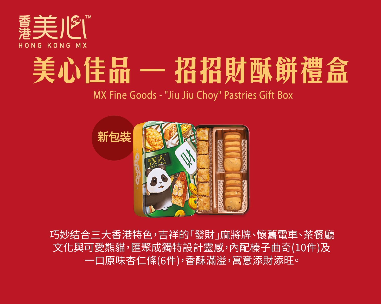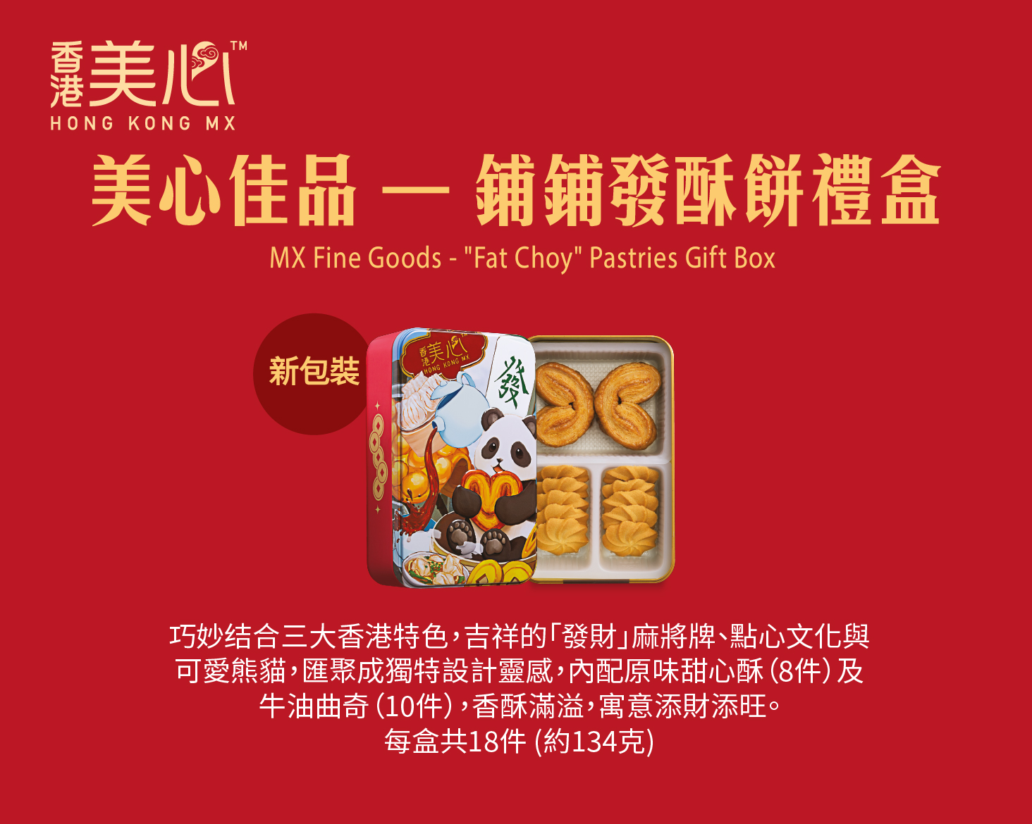 巧妙结合三大香港特色,吉祥的「發財」麻將牌、點心文化與可愛熊貓,匯聚成獨特設計靈感,內配原味甜心酥(8件)及牛油曲奇(10件),香酥滿溢,寓意添財添旺。