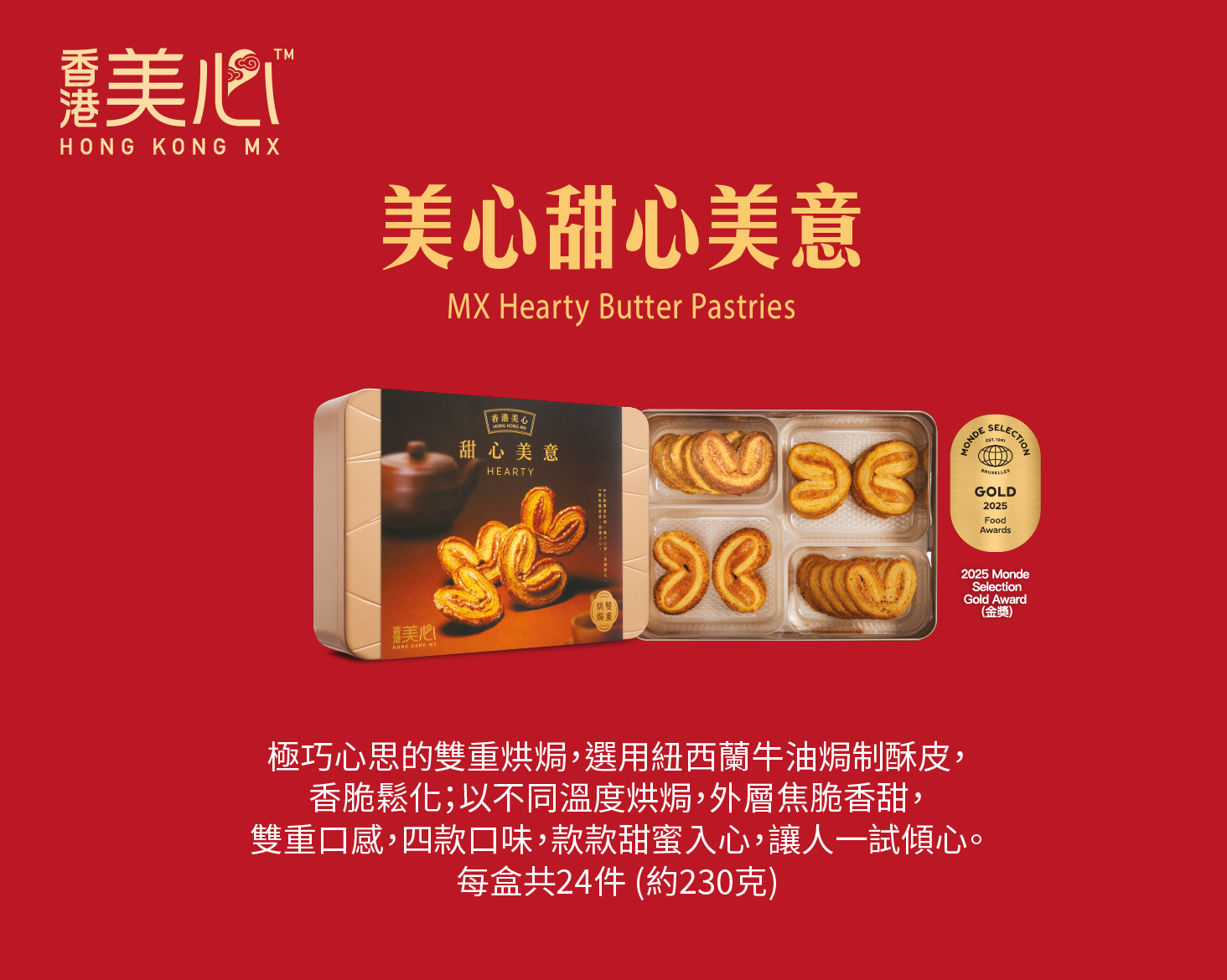 極巧心思的雙重烘焗,選用紐西蘭牛油焗制酥皮,香脆鬆化;以不同溫度烘焗,外層焦脆香甜,雙重口感,四款口味,款款甜蜜入心,讓人一試傾心。