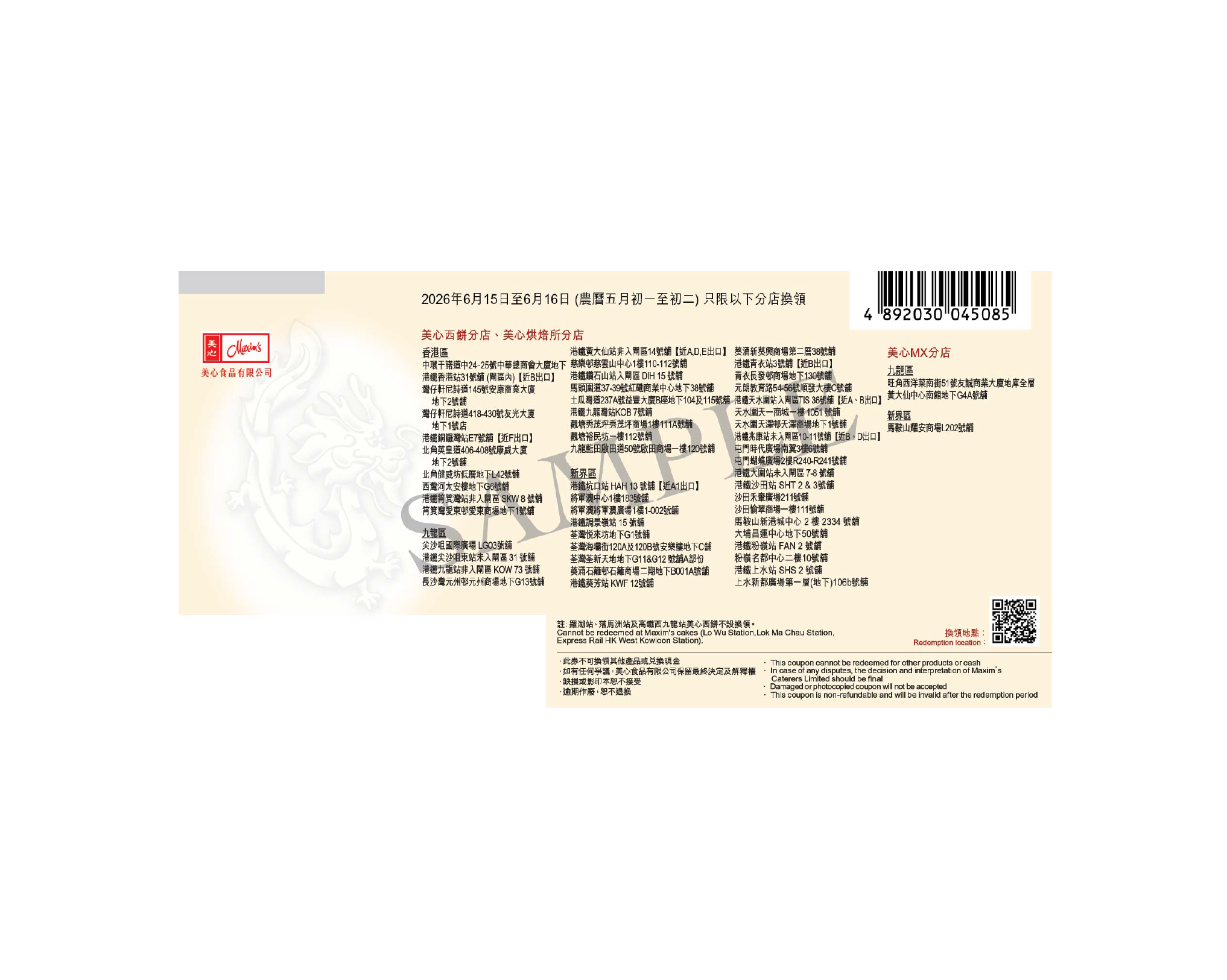 2026年06月01日至06月14日 全線美心西餅分店換領