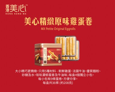大小精巧更精緻,只用5種材料 - 新鮮雞蛋、法國牛油、優質麵粉、砂糖及水,啖啖濃郁蛋香及牛油味,味香純正,更細膩的味覺享受;每盒4個獨立小包,每小包有9條蛋卷,方便分享。