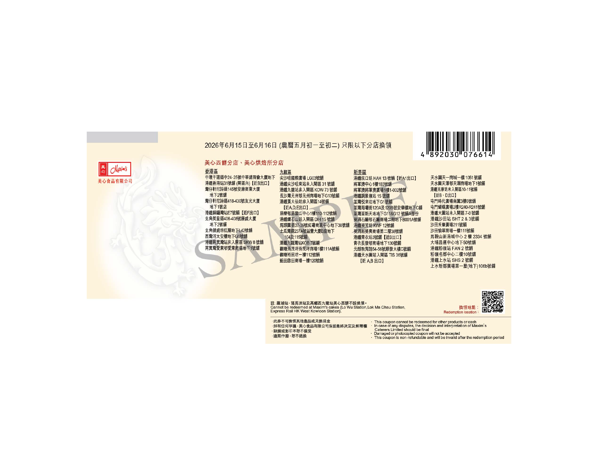 2026年06月01日至06月14日 全線各美心西餅分店換領