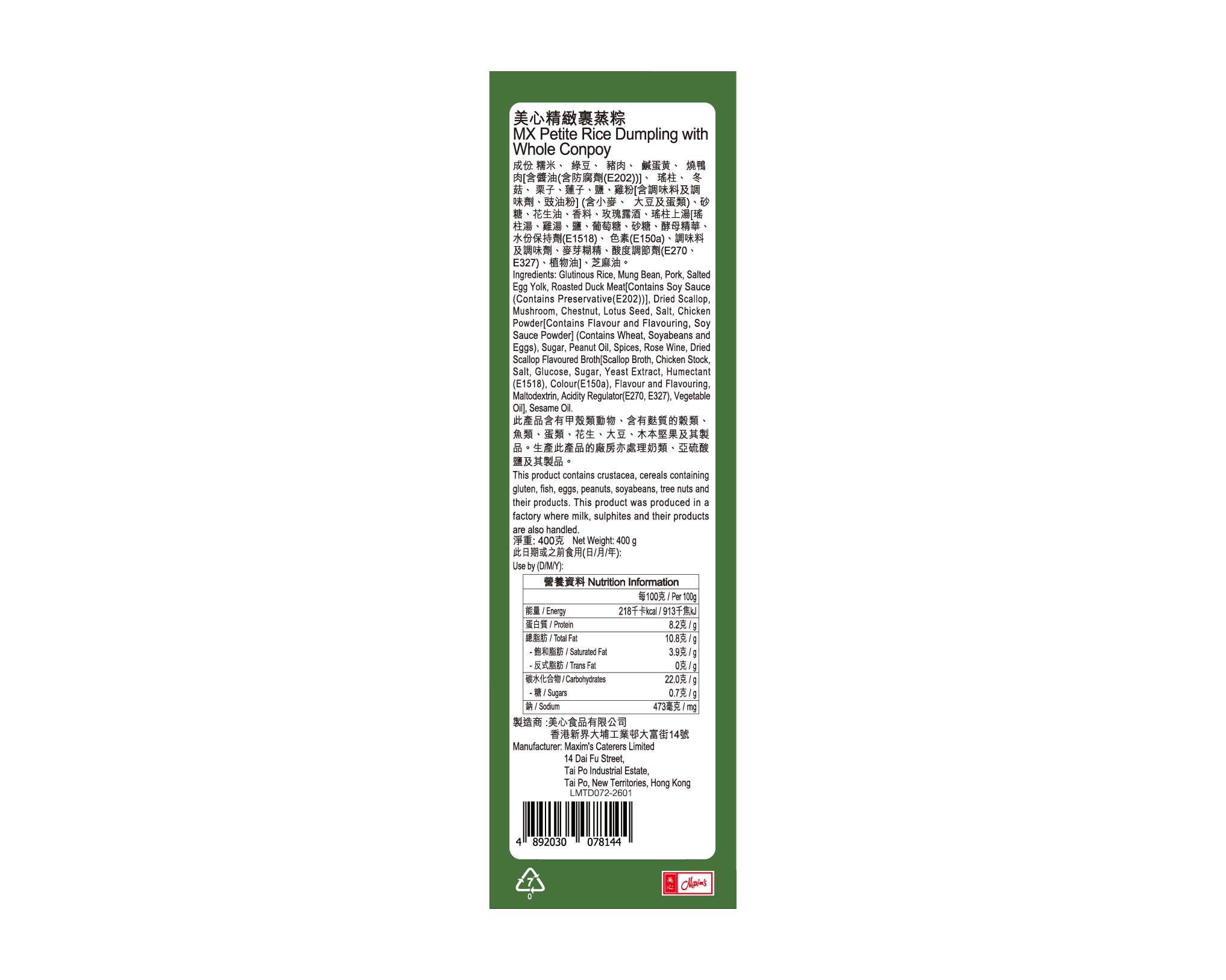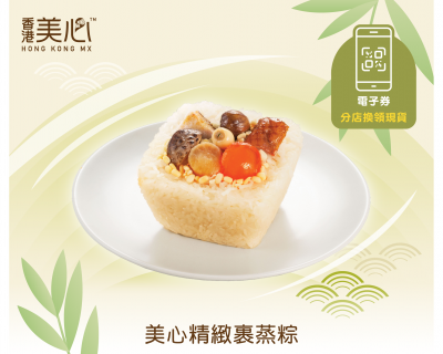 外型精緻的瑤柱裹蒸粽用料同樣豐足,粒粒軟糯糯米,鬆化綠豆,特選瑤柱及燒鴨,加上入口即溶的腩肉和甘香鹹蛋黃、厚肉花菇,蓮子及甘栗,是屬於獨享或小家庭的滋味!(每隻約400克)