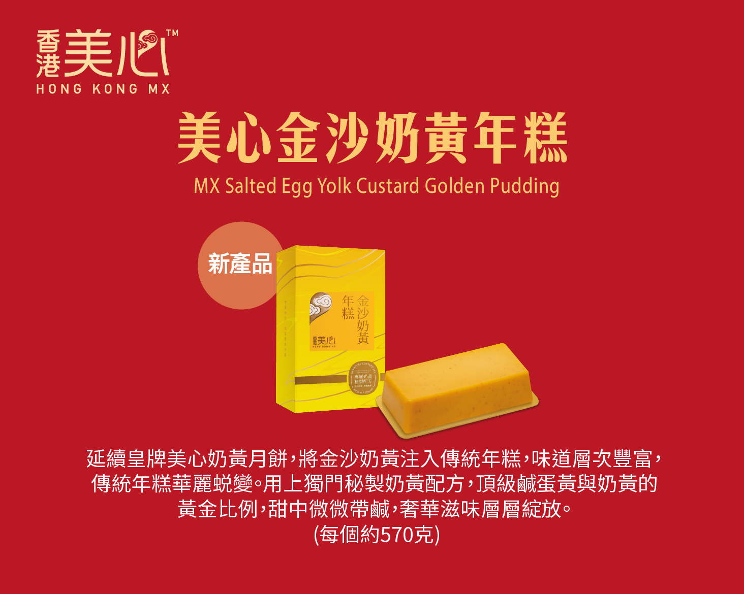 皇牌美心奶黃月餅配方華麗蛻變,將金沙奶黃注入傳統年糕,甜鹹層次豐富,帶來奢華享受。