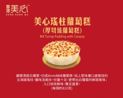 嚴選清甜白蘿蔔,切成8mm絲絲蘿蔔條,加上惹味兼口感極佳的北海道瑤柱,臘味及蝦米,份量十足,更帶出白蘿蔔的鮮甜美味;入口啖啖鮮味,豐足盛意,細嚐新年的最好味道!