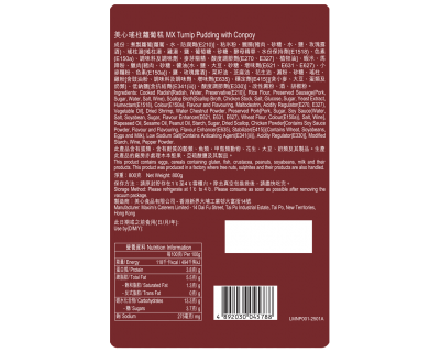 此產品含有甲殼類動物、含有麩質的穀類、魚類、蛋類、花生、大豆、奶類及其製品。生產此產品的廠房亦處理木本堅果、亞硫酸鹽及其製品。