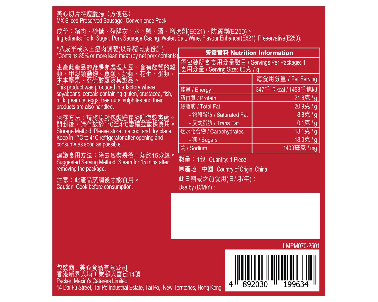 美心切片特瘦臘腸 (方便包) (電子禮券)
